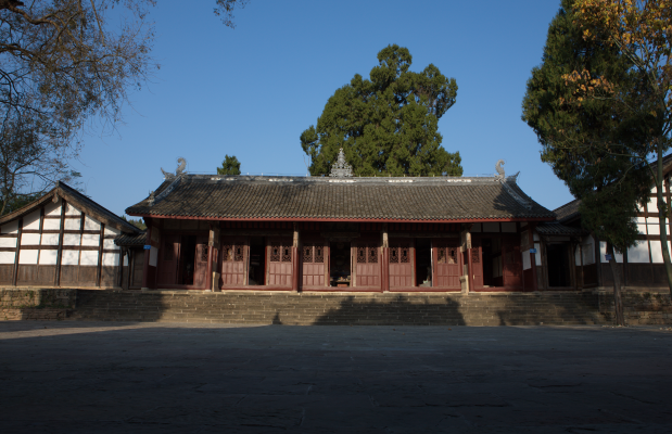 马鞍寺位于游仙区信义镇十村四社马鞍山麓,坐东北向西南,建筑面积3100平方米,占地面积6348平方米。马鞍寺始建于明,毁于明末,重建于清乾隆年间。马鞍寺中轴线上呈纵向布局,乐楼、天王殿、大雄宝殿、观音庙、玉皇殿与两侧厢房组成一闭合式建筑群体。乐楼为二层楼式建筑,清同治六年建。面阔三间,长13.05米,进深二间,宽11.5米,歇山顶抬梁式木穿斗结构建筑,高石础通柱,一楼敞亮,远望之于茂林若悬空“蜃楼”,乐楼台部向外突出,两耳室壁间绘有民间壁画和数则墨书戏班题记。天王殿、大雄宝殿、观音殿,建于清乾隆五十九年至六十年。三殿同为悬山式木穿斗结构建筑,面阔均为五间,长22米,进深三间,宽12米。大雄宝殿壁上与其他建筑的横梁、柱坊上绘有许多壁画、图画。玉皇殿位于观音殿后,面阔仅三间长10.5米,进深三间,宽度为5.5米,悬山顶抬梁式木穿斗结构建筑,此殿和两侧厢房分别建于清道光、同治年间。同时,寺内还保存有清石碑10通,多为记事碑和布施功德碑,但其中光绪七年的义学碑是富有史料价值的碑文,把当时在寺内办义学的宗旨,十二条学规都作了详细记载,对今天办学仍有启迪(照片3-35/3-36)。