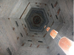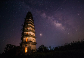 文风塔位于魏城镇青杠村10组钟万贵宅东南面50米处,坐东南向西北,建于清光绪五年。塔为六面体密檐式建筑,共13层25米。该塔一层高4.53米,边长4.65米,壁厚1.36米。塔身置于条石砌成的基石之上,南面有一塔门进入,塔门高2.35米,宽0.91米。塔檐伸出塔身0.5米,该塔原建的塔刹被雷电击毁。塔层的高度由底到高依次递减。塔1和2层供奉的文昌帝君和魁星二神在“文革”中被毁。传说魏城镇长年多灾、多难,风水不好,后建文风塔用于镇妖驱邪(照片3-53/3-54)。